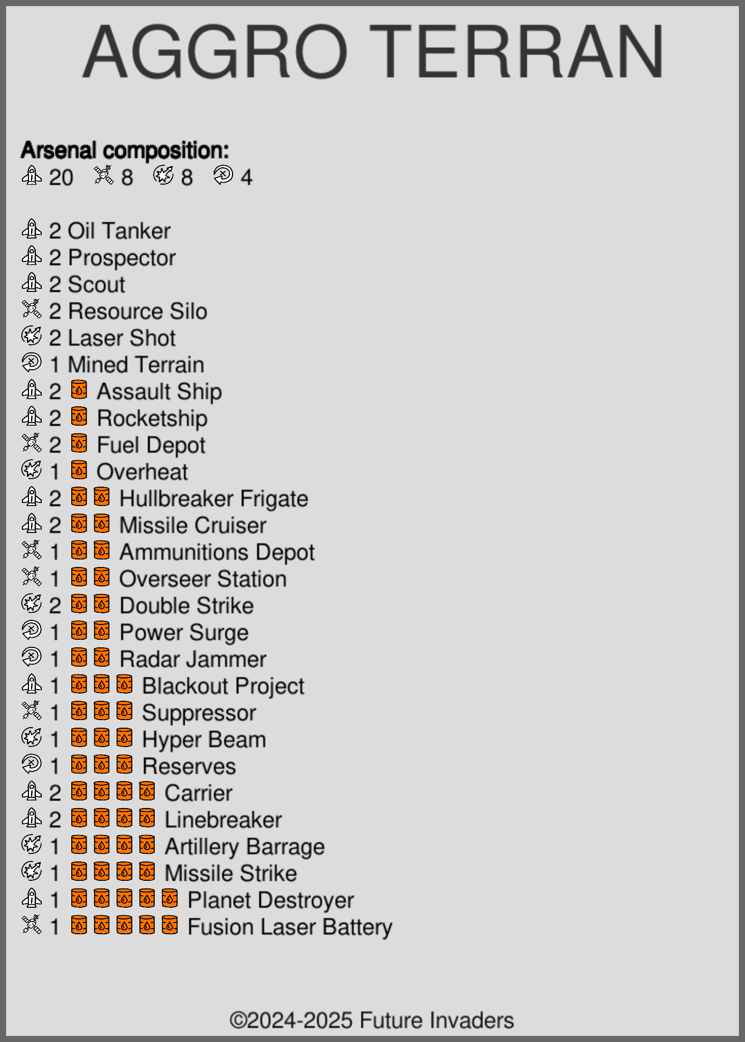 This arsenal's playstyle is to slowly but regularly deal damage to its opponent's bases until they fall.